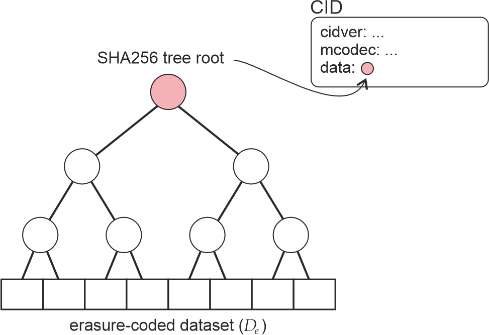 with a Reed-Solomon Code[15] by extending it into a new dataset which adds an extra parity blocks to (Sec. 4.3). This effectively adds new slots to the dataset. Since we use a systematic code, remains a prefix of ; - computes two different Merkle tree roots: one used for inclusion proofs during data exchange, based on SHA256, and another one for storage proofs, based on Poseidon2 (Sec 4.3);